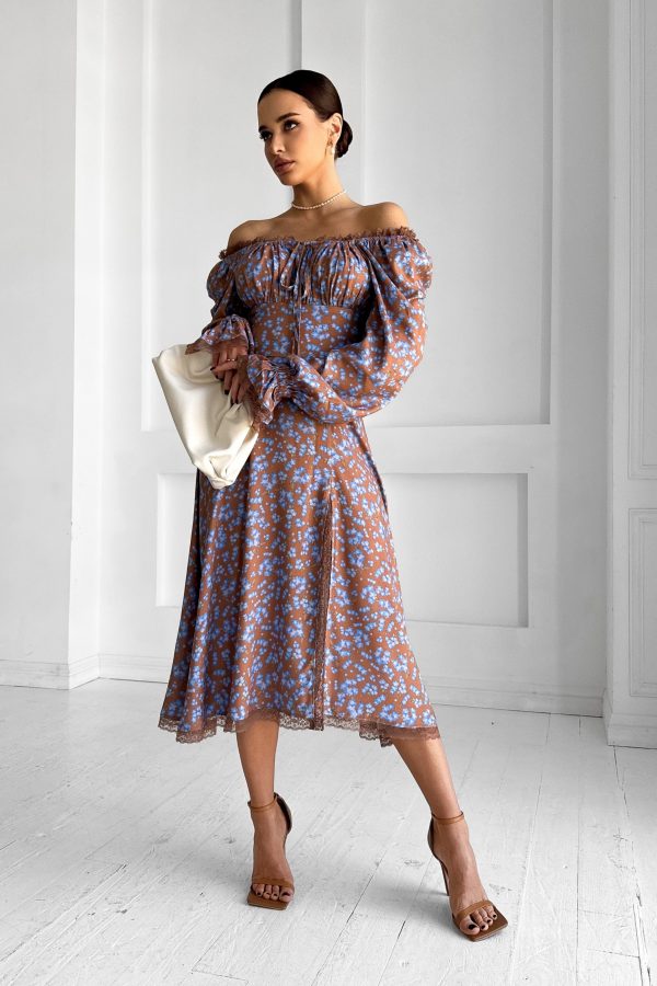 Платье миди из итальянской вискозы с длинными рукавами, с кружевом Прилегающий силуэт С открытой зоной декольте, с длинными рукавами фонарик, с завышенной талией, со сборкой на груди, с юбкой трапецией, с разрезом на ноге, с кружевом С потайной застежкой на спинке   Ткань: Италия Состав ткани: 100% вискоза Длина: 110-112…