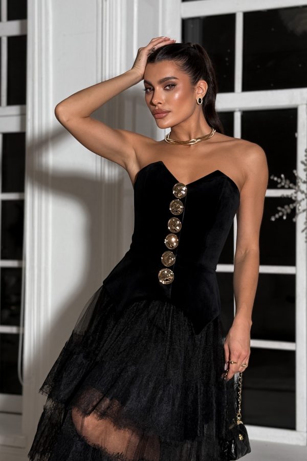 8 500 грн SKU: 1178A corset-style top made of Italian velvet with gold buttons Fitted silhouette Slim fit, corseted, boning, with a shaped peplum, strapless Snap-button closure at the front, with decorative gold buttons Fabric composition: 70% cotton, 30% polyester Lining composition: 100% viscose Length: 50-55 cm -