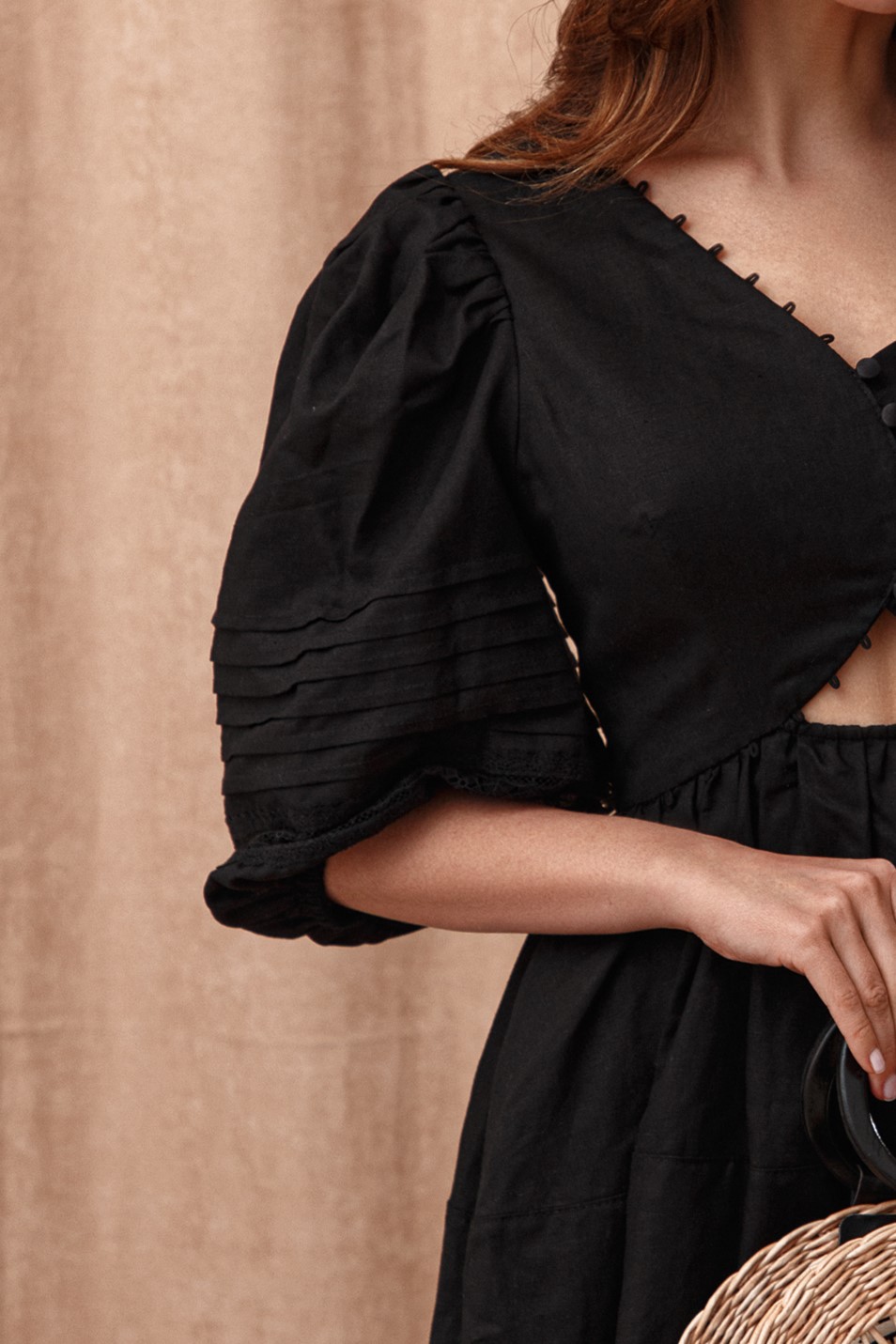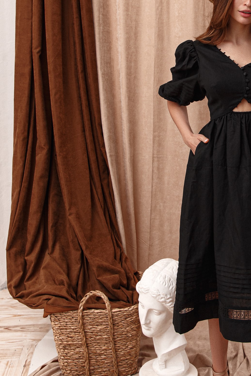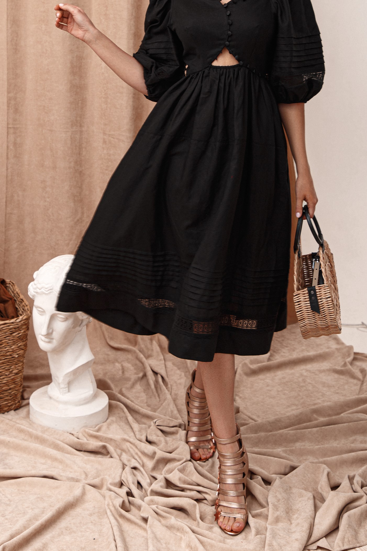 Linen midi dress with a shaped neckline, puffy sleeves, buttons and lace