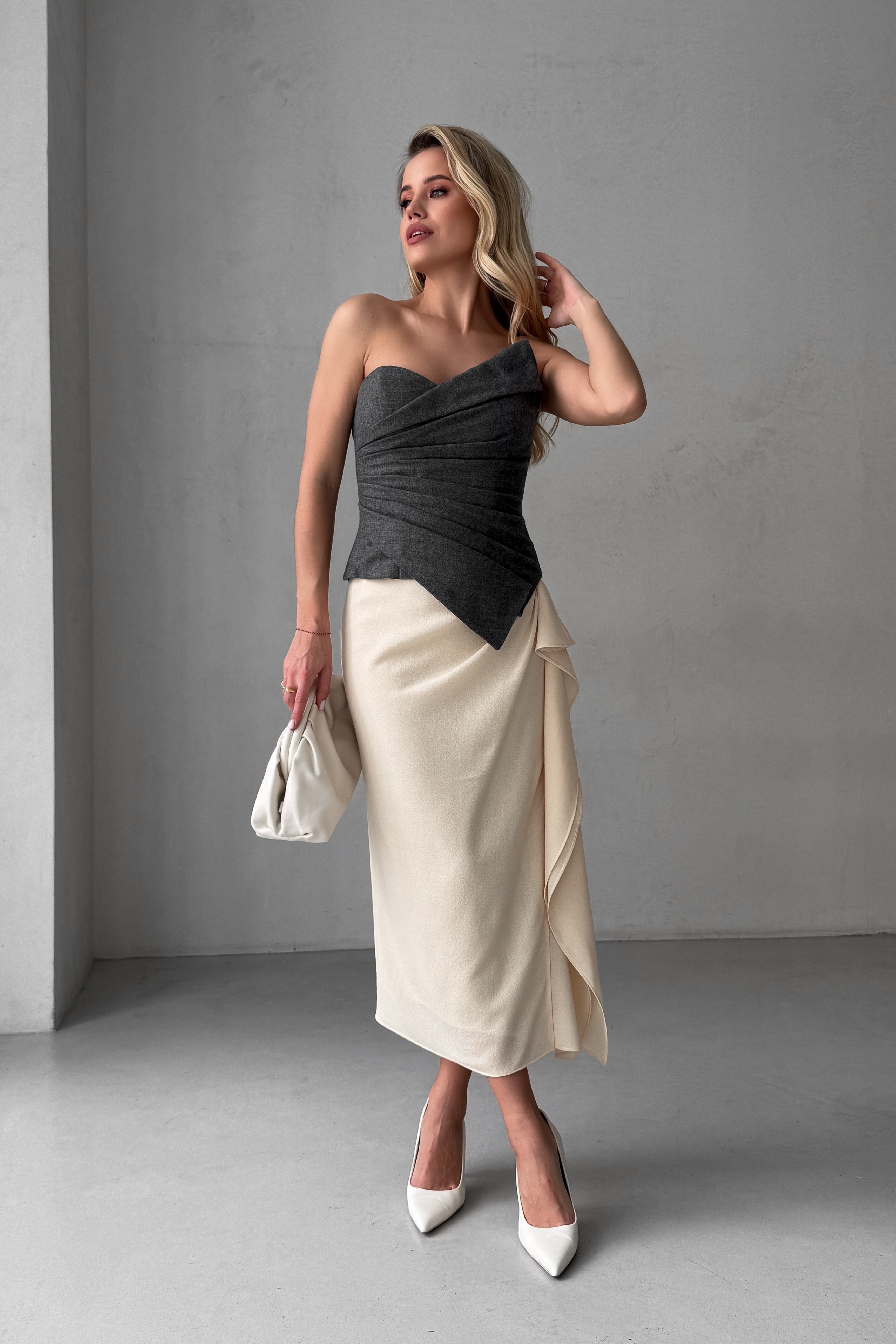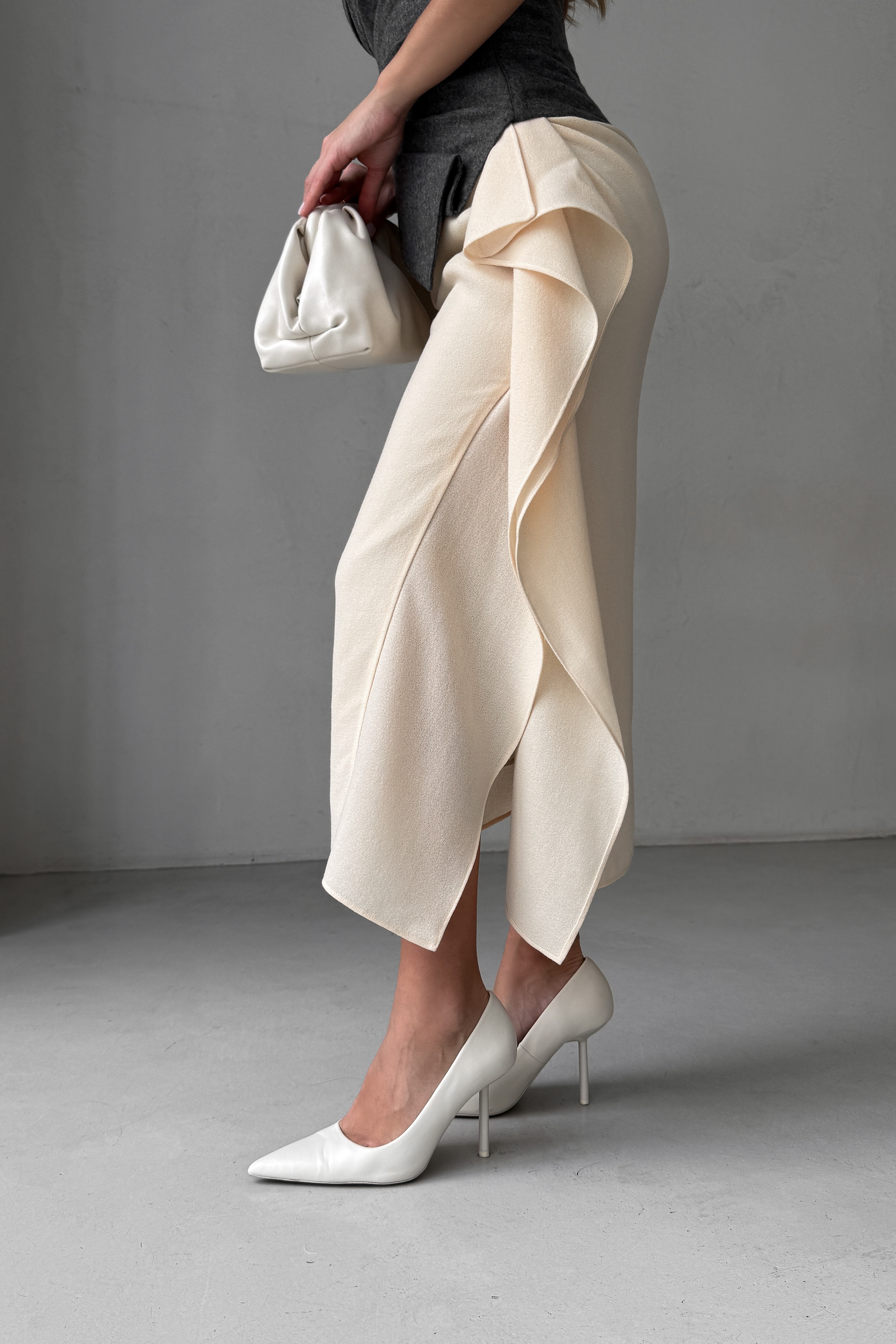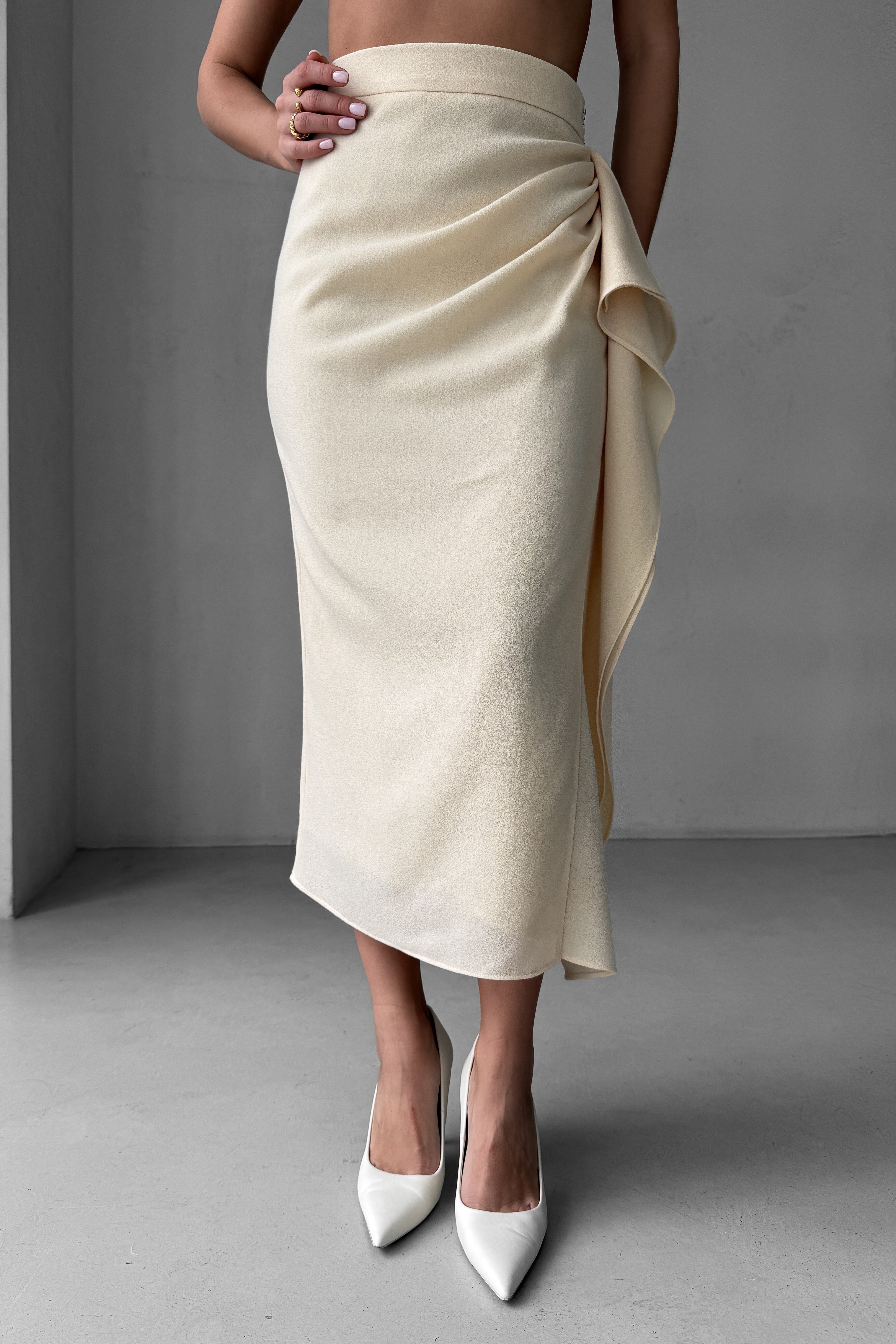 - Юбка с высокой талией, ниже колен, с асимметричной драпировкой, с разрезом и воланами сбоку