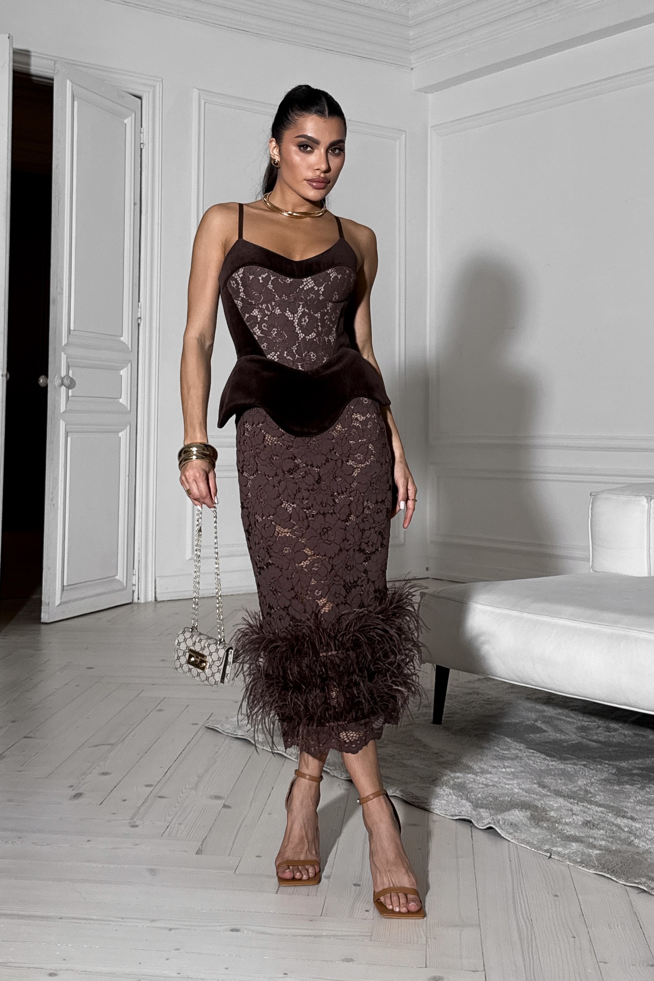 - З оксамитовим поясом, нижче колін, зі шліцею, з пір’ям по низу, з потайною блискавкою на спинці