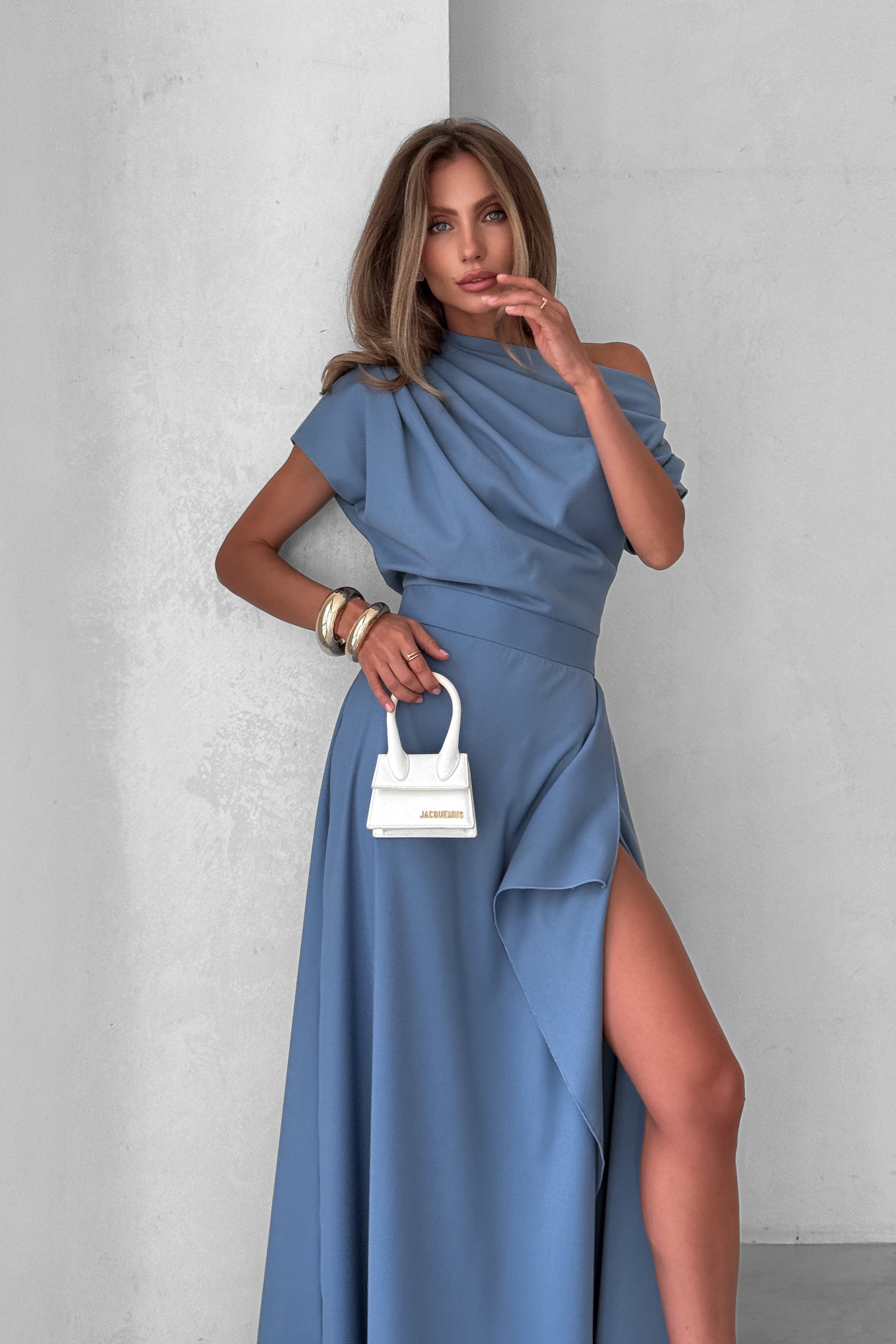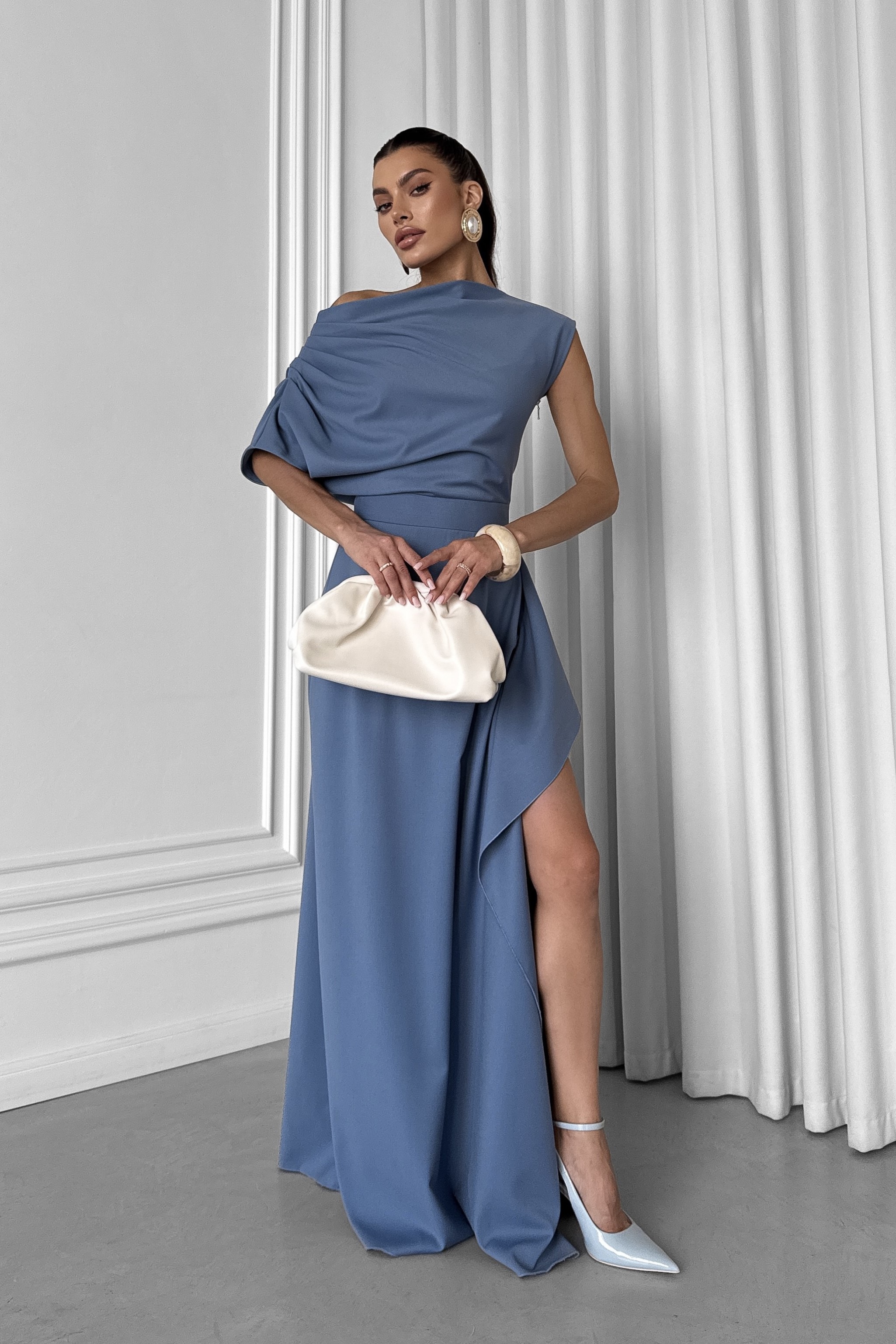 Довга асиметрична сукня з драпіруванням з розрізом на нозі, Sarah Berlin
